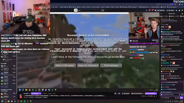 00:11:58Der Stream beginnt mit der Nachricht, dass Noriax für sechs Tage von Minecraft gebannt wurde, was im Chat für Aufregung sorgt. Es wird die Idee diskutiert, eine V-Klasse zu mieten und nach Stockholm zu Mojang zu fahren, um die Gründe für den Bann zu klären und Content zu generieren. Verschiedene Personen, darunter Wieland und Mitaschi, werden als potenzielle Mitfahrer oder Unterstützer in Betracht gezogen. Es entsteht eine lebhafte Diskussion über die Logistik und die Machbarkeit dieser spontanen Reise, die als "generational content opportunity" bezeichnet wird. Die Idee, Mojang direkt zu konfrontieren, wird als witzig und potenziell sehr unterhaltsam empfunden, auch wenn die praktischen Herausforderungen groß sind. Der Streamer ist entschlossen, die Reise durchzuziehen, um Noriax's Bann aufzuheben und gleichzeitig einzigartigen Content zu schaffen.