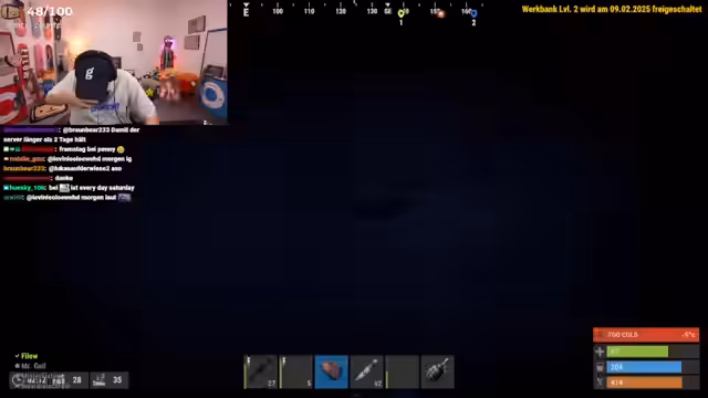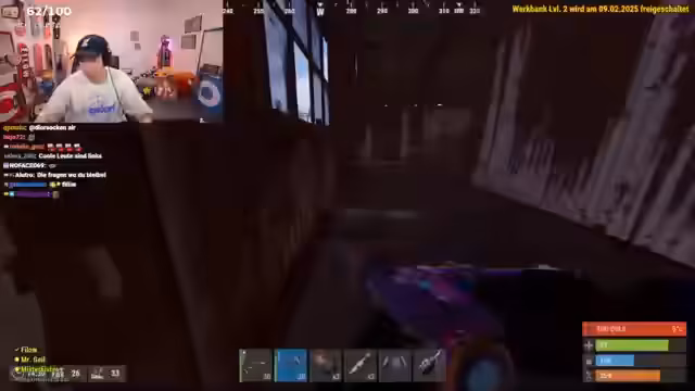 09:49:24Zu Beginn des Streamings gibt es technische Schwierigkeiten, da das Programm OBS abstürzt und der Stream neugestartet werden muss. Gleichzeitig werden laute Drohnen-Sounds wahrgenommen, was auf laute Kampfhandlungen in der Rust-Welt hindeutet. Nach dem Neustart geht es schnell in das Spiel zurück und der Streamer konzentriert sich auf das Sammeln von Ressourcen und das Bauen von Fallen, um sich auf bevorstehende Aktionen vorzubereiten.