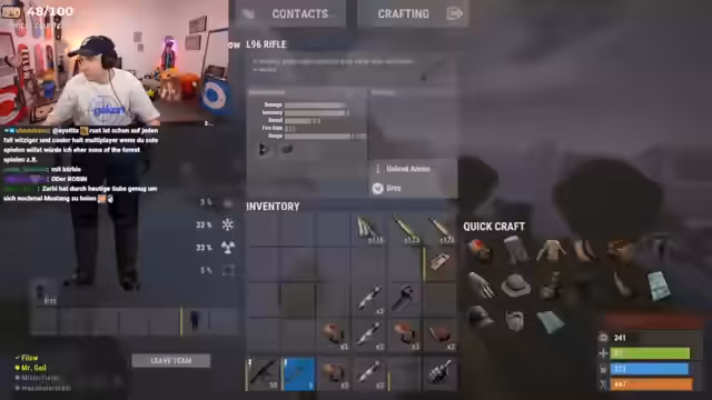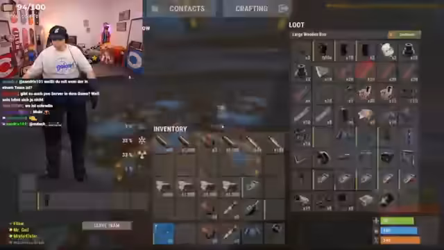 01:55:50Die Gruppe plant eine riskante Expedition zu einem Cargo-Schiff, da es extrem viel Loot verspricht. Da hohe Wahrscheinlichkeit besteht, von anderen Spielern angegriffen zu werden, bereiten sie sich vor: Sie nehmen nur eine Waffe mit, recyclen Stoff und überlegen, wie man sicher auf das Schiff kommt. Es ist ein riskantes Unterfangen.