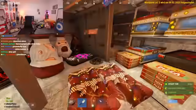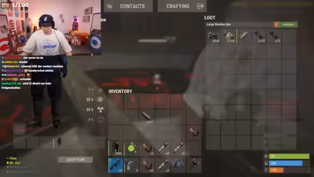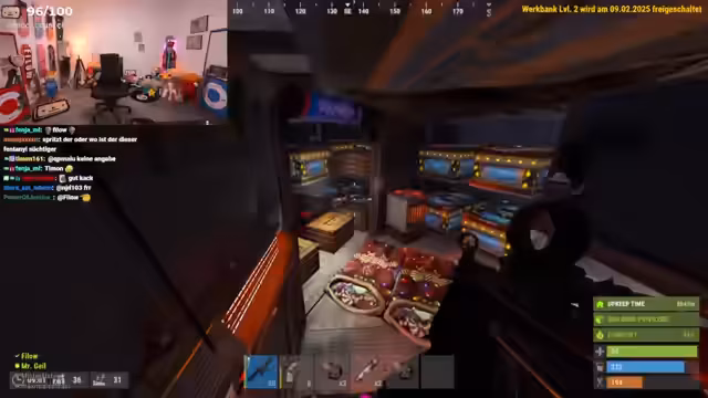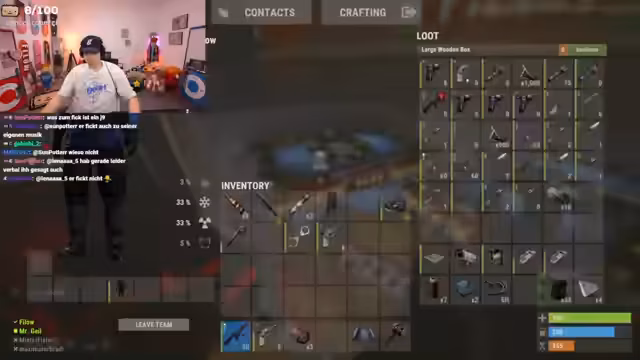 08:31:33Nachdem der Streamer eine Basis auf einer Ölplattform errichtet hat, kommt es zu einem bewaffneten Konflikt mit benachbarten Spielern. Zunächst wird der Kill eines Nachbarn gefeiert, was den Konflikt eskalieren lässt. Die Gegner fordern die Rückgabe ihrer Gegenstände, und nach anfänglicher Spannung einigt man sich darauf, einen Teil der Beute zurückzugeben, um den Frieden zu wahren und auf Augenhöhe zu bleiben. Trotzdem wird befürchtet, dass die Gegner, insbesondere 'Chef Strobel', später zum Raid kommen werden, was zu einer angespannten Stimmung führt.