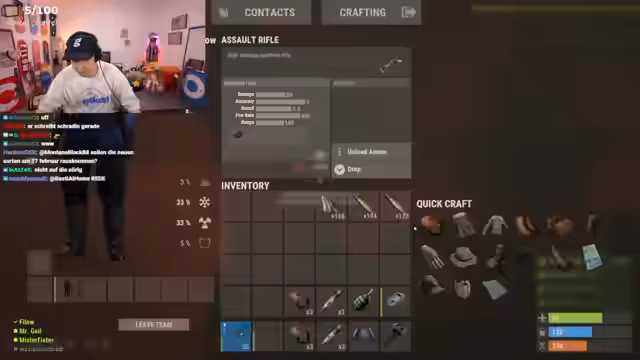 05:36:28Ein technischer Bug, der den Streamer blockiert und einen Neustart des Spiels erfordert, stört den weiteren Ablauf. Währenddessen wird das Thema eines möglichen Raids durch ein anderes Team namens 'Chef' angesprochen. Der Streamer ist jedoch unbesorgt, da sie nach dem Helikopter-Loot und dem Farm-Erfolg stark aufgestellt sind. Er plant, die Basis weiter mit Metall und HQ zu stärken und fühlt sich gut gerüstet. Der Streamer nutzt die Zeit auch für private Kommentare, wie seine gesündere Ernährung und sein Verlangen nach einem gesunden Toast.