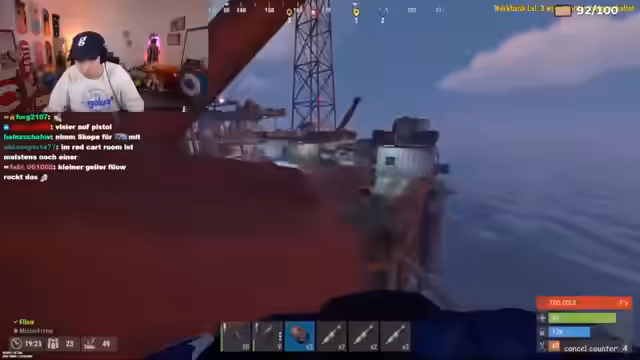 09:15:21Ein spontaner Entschluss führt den Streamer und sein Team zum gerade gespawnten Frachtschiff, da es eine bessere Action als die geplante Ölplattform verspricht. Es wird entschieden, einen Helikopter zu nutzen, um Teammitglieder nacheinander auf dem Schiff abzusetzen, während die Lowgrade-Ressourcen vorbereitet werden.