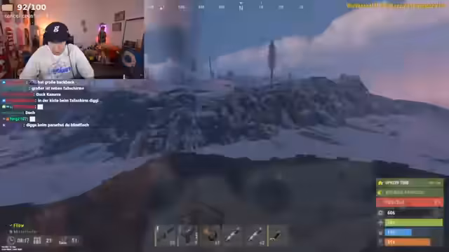 10:26:28Zusammen mit anderen Spielern wird geplant, einen großen Airdrop zu looten. Eine scheinbare Allianz wird ins Auge gefasst, in der jeder seinen fairen Anteil erhalten soll. Die Zusammenarbeit ist jedoch von Unsicherheit und Misstrauen geprägt. Es wird über die Stärke des gegnerischen Teams diskutiert und die eigene strategische Unterlegenheit in direkten Kämpfen eingestanden. Der Fokus liegt darauf, durch geschicktes Taktieren und Ausnutzen von Spielmechaniken wie Bunkern das Loot sicherzustellen und den Verlust der eigenen Basis zu kompensieren.