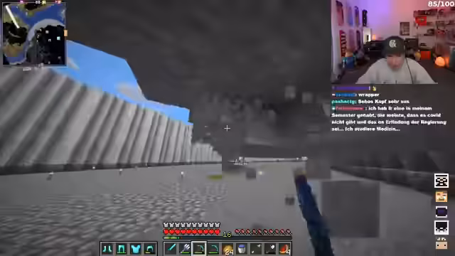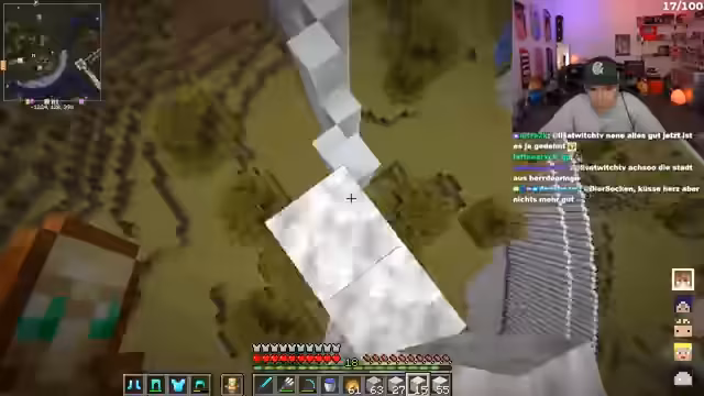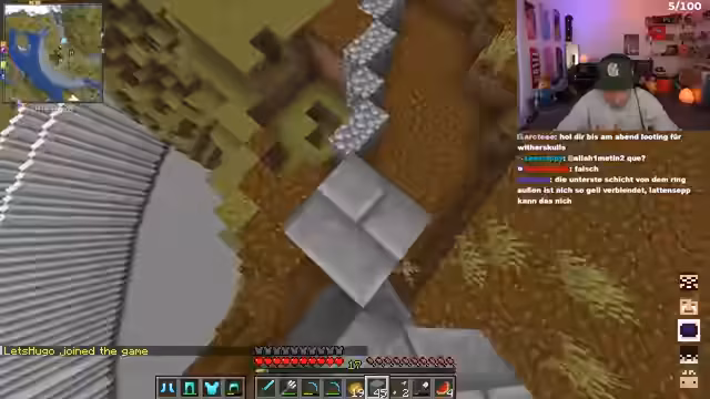 04:58:05Der Streamer diskutiert über einen als 'miesesten Grind ever' bezeichneten Minecraft-Bau, bei dem Goldhain eine wichtige Rolle spielt. Er beschäftigt sich mit der Entfernung von Blättern, um Setzlinge besser wachsen zu lassen, und debattiert mit dem Chat über die Effektivität. Dabei erwähnt er plötzlich fallen gelassene Gegenstände wie einen Mantarochenkopf und formuliert die These, dass mehr Gegenstände droppen, wenn Objekte von alleine zerfallen. Er gerät in einen recht humorvollen, aber leicht verwirrten inneren Monolog, in dem er sich über den Chat lustig macht und über Gerüchte, seine Adresse sei im Umlauf.