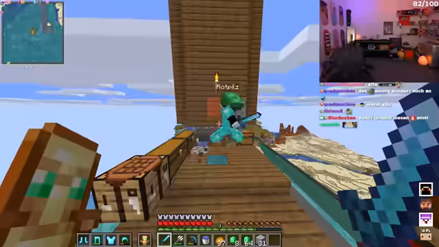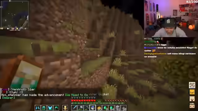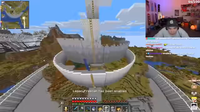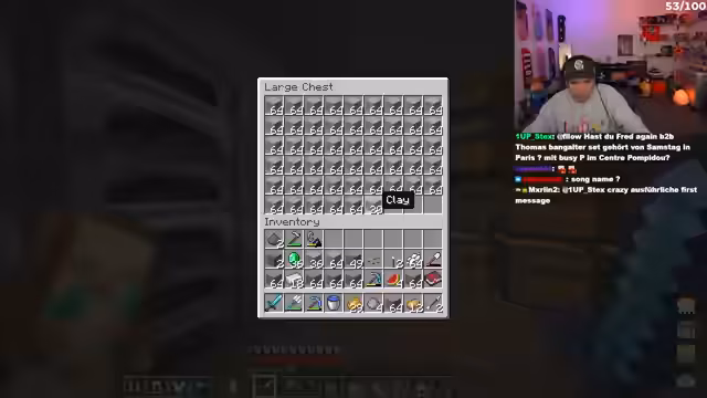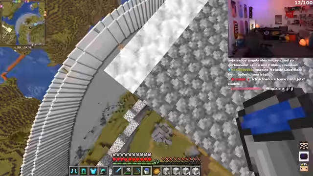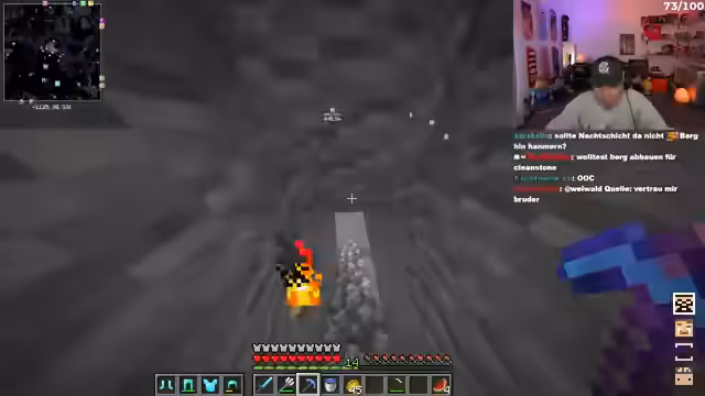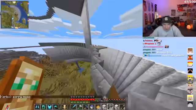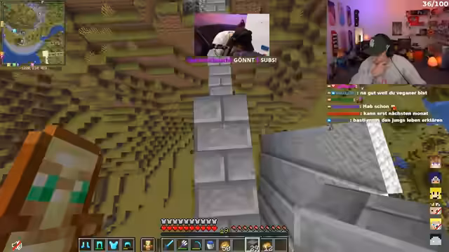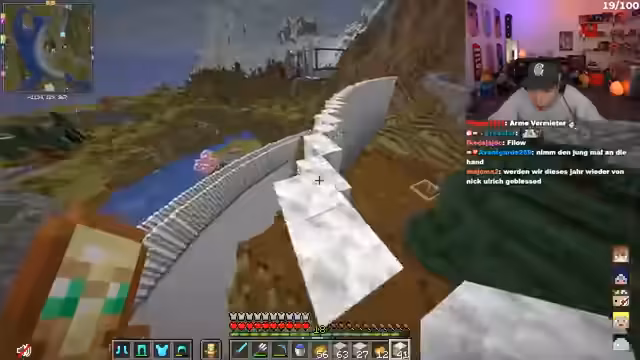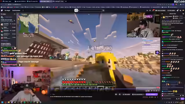 01:41:47Der Fokus liegt auf dem gemeinsamen Spielen und Bauen in Minecraft, insbesondere an der Mauer. Dabei kommt es zu technischen Problemen, als ein ambossierter Schaufel-Spitzhacke „zerfliegt“. Um den Gegenstand zu reparieren, wird eine Mending-Verzauberung benötigt, welche das Grinding für Erfahrungspunkte (XP) notwendig macht. Die technische Seite des Streamings, wie ein gemeinsamer Chat mit einem anderen Kanal, führt zu Konflikten und wird letztlich wieder deaktiviert.