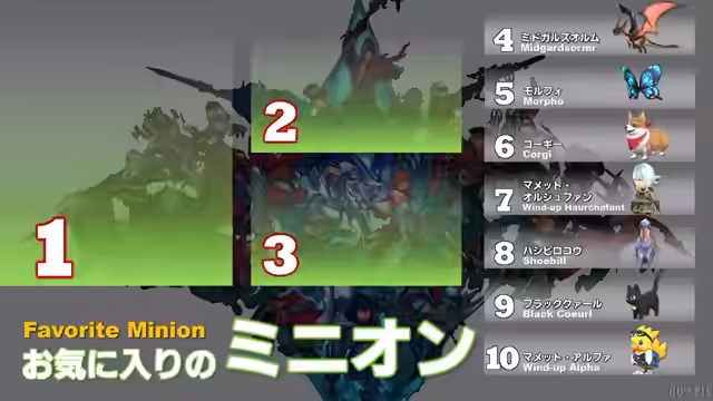 02:07:04Es wurden die beliebtesten Reittiere vorgestellt, wobei darauf hingewiesen wurde, dass einige Inhalte durch die Story begrenzt sind, Spoiler-Warnung. Die Top 10 der beliebtesten Reittiere wurden von Platz 10 bis 4 aufgezählt: Black Chocobo, Regalia Type-G, Garland GL-2, Pod 602, Mega Shiba, Amaro und Demi-Azma. Die Top 3 waren: Fatter Cat (Platz 3), SDS Fenrir (Platz 2) und Chocobo (Platz 1). Anschließend wurden die beliebtesten Minions von Platz 4 bis 10 genannt: Wind-Up Alpha, Black Coral, Shoebill, Wind-Up Horchifon, Corgi, Morpho und Mid-Guard Swimmer. Die Top 3 Minions waren: Lesser Panda (Platz 3), Fat Cat (Platz 2) und Starbird (Platz 1). Abschließend wurde nach den beliebtesten Heimatorten gefragt, wobei Shirogane, Mist, Lavender Beds, Razat Han, Ishgard, The Crystarium und Uldah genannt wurden. Die Top 3 waren: Old Charlien (Platz 3), Gridania (Platz 2) und Limsa Lominsa (Platz 1).