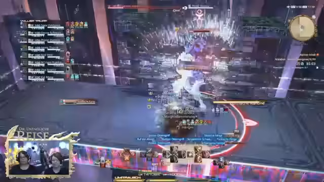01:01:57Es geht zu Arkadion R4 über. Das Passwort für die Gruppensuche ist 33333. Es wird ein Tank gesucht, und Senna hilft aus. Julia nimmt den Tanzpartner von Crepido an, aber fühlt sich verantwortlich, nicht zu sterben. Sie gibt zu, emotional beeinträchtigt zu sein, aber die Gruppe vertraut ihr. Sie versucht, sich die Mechaniken mit 'links, links, rechts' zu merken. Es wird über einen Kill-Counter für Julia's Tode gewitzelt. Es wird erwähnt, dass man noch gar nicht in Waligamanda war, was die psychologische Vorbereitung darauf ist. Julia sagt, dass sie keinen Viper spielen kann und auch den Piktomanten nicht versteht. Sie bittet darum, ihr die Klassen nicht zu erklären. Es wird erklärt, wie man erkennen kann, wohin der Boss feuern wird. Am Ende wird M4 ohne Tode geschafft, und es wird sich bei allen bedankt.