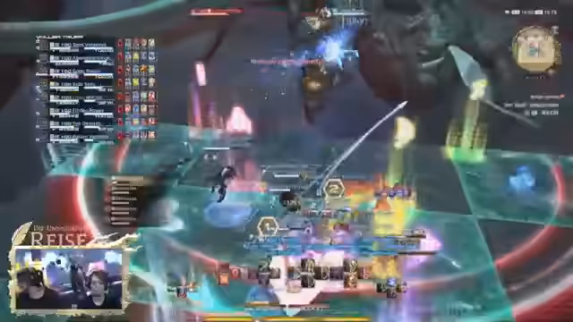 00:32:14Es wird zum nächsten Raid, Arkadion R2, übergegangen, auch bekannt als die Biene oder Susi Sum Honig Süß. Das Passwort für die Gruppensuche ist 5230. Man freut sich über die gefüllte Taverne und den Trubel, den dies für neue Spieler erzeugt. Die Cutszene wird für die Fans abgespielt. Es wird festgestellt, dass sich eine Lala-Biene in der Gruppe befindet. Es wird überlegt, wo man die Effekte im Spiel ausschalten kann, da das Porträt kaputt gegangen ist. Nach längerer Suche in den Charakter-Konfigurationen wird die Einstellung endlich gefunden. Es wird sich bei den Zuschauern und Marie für die Hilfe bedankt. Es wird über die Musik des Raids gesprochen und wie sehr sie gemocht wird. Grüße gehen an die französischen Spieler im Chat. Es wird über traumatische Erlebnisse in vorherigen Raids gesprochen. Eine spezielle Tank-Strategie wird angewendet, bei der der Tank alle Herzen in der Mitte tankt. Nach dem Raid wird ein Screenshot mit dem Publikum gemacht, wobei die Bienchen und der große Chocobo im Hintergrund sein sollen.