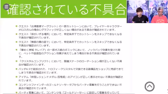 03:08:21Ein spezifischer Bug, der in bestimmten Bosskämpfen auftrat, wurde gelöst. Dabei konnte der Knockback-Effekt dazu führen, dass die Effekte von Haustieren oder aufgestellten Gattern verschwanden. Auch die fehlenden Fußschritte in der Raszhan-Instanz wurden behoben. Ein weiterer Fehler, bei dem die Teilnehmeranzahl in der Partysuche im Gold Saucer nicht korrekt im Inhaltssuchfenster angezeigt wurde, wurde ebenfalls behoben.