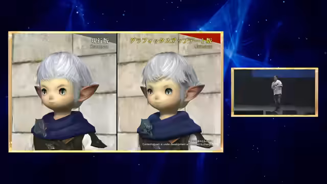 01:55:31Ein großes Projekt ist das Grafik-Update für alle Charakter-Rassen und -Outfits. Yoshida zeigt den direkten Vergleich zwischen dem alten und dem neuen Modell für jede Rasse (Miqo'te, Roe, etc.), bei dem Texturen, Gesichtsmerkmale und Haare deutlich verbessert wurden. Zudem wird ein neues Zweifarben-Färbsystem für Ausrüstung vorgestellt, das mehr Möglichkeiten zur Individualisierung bietet. Um die Umstellung zu erleichtern, erhalten alle Spieler einen kostenlosen Fantasia bei Release.