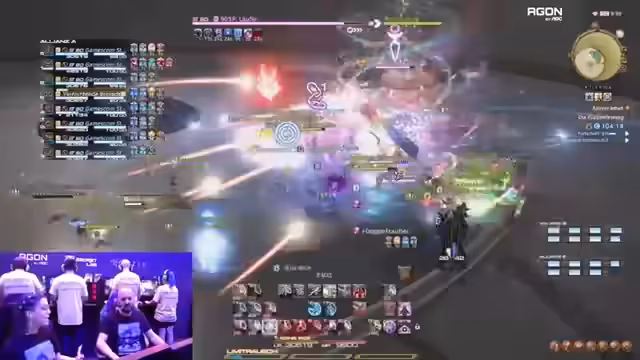 00:00:35Der Stream beginnt auf der gamescom mit einem Special Event, dem Near Raid. Da die ursprünglichen Moderatoren erkrankt sind, springen sie spontan ein. Der Raid wird mit acht Ambassadoren gespielt, und auch die Community von zu Hause kann auf dem Server Spriegern im Datenzentrum Chaos via Party Finder teilnehmen. Die Gruppe ist schnell voll, und der erste Raid, die kopierte Fabrik, beginnt.