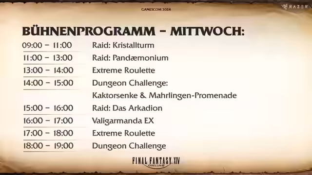 Der erste Tag der Gamescom stand im Zeichen von Final Fantasy XIV. Der Crystal Tower Raid wurde mit Ambassadors und Mitgliedern der Abenteurer-Gilde gespielt. Zuschauer hatten die Möglichkeit, sich anzumelden und mitzuspielen. Es gab auch Gewinnspiele, wie die Battle Challenge mit Valigamanda, bei der T-Shirts verlost wurden. Die Moderatoren betonten die Unterstützung durch Ambassadors und die Gewinnchancen für alle.