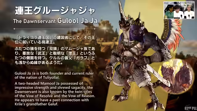 01:13:25Die wichtigsten neuen Charaktere der Erweiterung wurden vorgestellt. Dazu gehören Erwinville, eine Wolkenmensch-Frau, die zur Heldengruppe stößt, und ihr Adoptivvater Galaf, der mit der Legendenhaften Goldenen Stadt verbunden ist. Ebenfalls erwähnt wurden die Dawn-Servant Gulul-Zhazhah, der zweiköpfige Herrscher, und seine Kinder Zoralzha und Koana, die in der Thronfolge stehen. Alle verfügen über einzigartige Designs und Hintergründe.