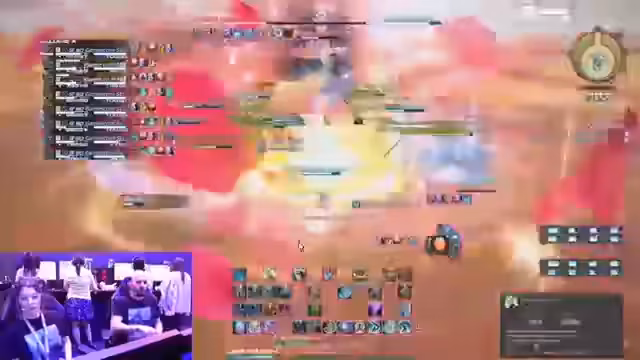 01:38:32Die Raid-Reihe wird für ihre Story, Optik, Musik und Bosse gelobt, und es wird empfohlen, sie mitzumachen. Die Heiler sind wieder am Leben, aber ein Tank ist tot. Die DDs haben Feierabend und die Tanks machen weiter. Der Paladin sammelt immer noch fleißig Stecks. Es wird gefragt, warum die Challenge gestartet wurde. Die Revolverklinge hat bereits acht Stecks gesammelt. Es wird festgestellt, dass der LB (Limit Break) nicht voll wird. Es wird betont, wie viel Spaß es macht, das Spiel in dieser Konstellation zu erleben. Ein Maschinist rutscht auf seinen Patronenhülsen aus und stürzt ab. Die Ui wird ausgeblendet. Die Stacksammler werden auf die Bühne gerufen und nach ihrer Motivation gefragt. Sie erklären, dass sie eine Challenge untereinander gemacht haben, wer am meisten Stecks sammeln kann. Die Community wird für ihre Teilnahme und ihren Enthusiasmus gelobt. Es wird auf das weitere Programm auf der Bühne hingewiesen.