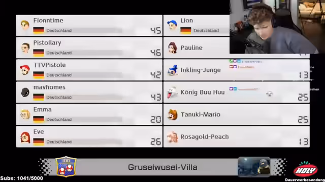 04:26:52Es wird angekündigt, dass die letzte Runde gestartet wird und Zuschauer werden aufgefordert, dem Spiel beizutreten. Es wird sich entschuldigt, dass versehentlich Teams aktiviert wurden und ein neuer Code wird geteilt. Zuschauer werden aufgefordert, dem Spiel erneut beizutreten. Es wird sich über die Teilnahme von Zuschauern gefreut und erklärt, wie man dem Spiel beitreten kann. Es wird versucht, das im Spiel gegen Carlos Gelernte anzuwenden. Es wird sich über die Teilnahme von Spongebob gefreut und festgestellt, dass man Nintendo Online benötigt, um mitzuspielen. Es wird sich über den Downer nach dem spannenden Spiel gegen Carlos geärgert. Es wird festgestellt, dass das Spiel mit den Zuschauern nicht so verschwitzt ist wie zuvor. Es wird bemerkt, dass nur die ersten sechs Plätze relevant sind, da danach Bots folgen. Es wird sich über eine gelungene Abwehraktion gefreut und auf den ersten Platz gefahren. Es wird auf die Möglichkeit hingewiesen, sich für einen Mod-Platz zu bewerben und sich über Glückwünsche gefreut. Es wird sich über die zufällige Auswahl von Strecken amüsiert und sich über die verschiedenen Spielernamen gewundert.