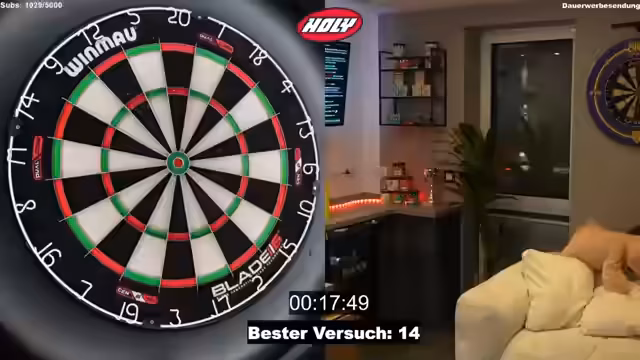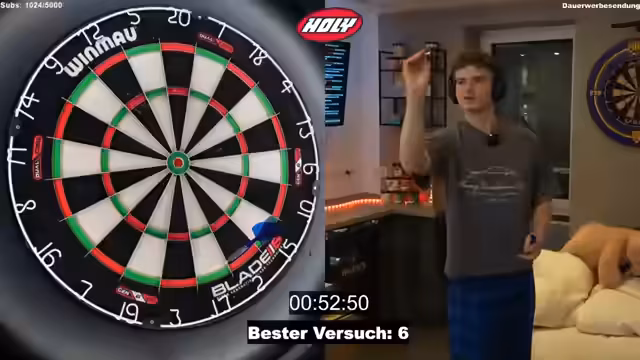 00:08:51Es wird ein neues Dart-Video angekündigt, in dem eine Challenge im Fokus steht, an der auch Carlos teilnimmt. Die heutige Challenge ist die Around the Clock Challenge, bei der die Zahlen von 1 bis 20 in aufsteigender Reihenfolge getroffen werden müssen. Bei einem Fehler muss man von vorne beginnen. Es wird eine Stunde lang versucht, so weit wie möglich zu kommen. Wer am Ende der Stunde den besten Lauf hat, gewinnt und erhält fünf Subs vom anderen. Die Regeln werden präzisiert: Getroffene Triple- und Doppelfelder zählen ebenfalls, aber es wird nicht die Punktzahl des Feldes addiert. Sollten beide Spieler die 20 erreichen, entscheidet ein Wurf auf das Bullseye über den Sieg.