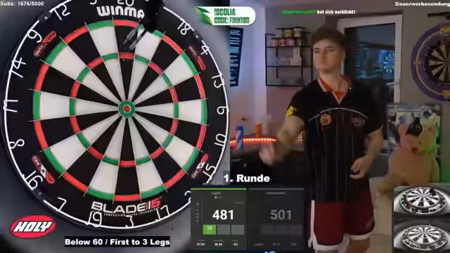 00:00:00Der Stream startet mit der Ankündigung der Jagd nach dem ersten Below-60-Turniersieg. Es wird erwähnt, dass das Turnier noch nicht voll ist und Zuschauer die Möglichkeit haben, dem Stream beizutreten. Ein Rückblick auf das vorherige Spiel gegen Felix wird gegeben, wobei die hohen Averages der Gegner hervorgehoben werden. Es wird angekündigt, dass eine Kooperation mit Holy verlängert wurde und man nun offiziell Holy-Partner ist. Vor dem Turnierstart werden noch ein paar Minuten zum Aufwärmen genutzt. Der Streamer spricht über die kurze Hose, die er trägt, und erwähnt, dass die kurzen Schlafis für den Sommer noch fehlen. Er äußert den Eindruck, dass er im ersten Spiel gegen Franzi aus München mit einem Average von 56 unterschätzt wird und die Reise in Below 60 eine Herausforderung sein wird. Nach einem verlorenen ersten Leg gegen Franzi, gelingt der Ausgleich zum 1-1, wobei der Gegner unerwartet viele Chancen liegen lässt. Der Streamer vermutet, dass der Gegner ihn absichtlich gewinnen lässt.