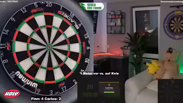 03:22:09Der Streamer spricht mit Carlos über ein für 250 Euro bestelltes LKW-Lenkrad und plant, Eurotruck-Simulator im Multiplayer-Modus zusammen zu spielen. Er kündigt ein YouTube-Video mit Carlos an, in dem sie die Handicap Dart Challenge spielen, ein Format, in dem der Streamer ungeschlagen ist. Carlos erklärt die Regeln der Handicap Dart Challenge, bei der ein Glücksrad bestimmt, welches Handicap die Spieler im 1-gegen-1 erhalten. Es gibt auch Joker, bei denen normale Legs gespielt werden können. Der Streamer erwähnt, dass Carlos in der Videobeschreibung verlinkt ist und bittet die Zuschauer, ihm auf Twitch zu folgen. Sie spielen um fünf Subs und der Streamer behält sich vor, bei Mini-Pfeilen zu entscheiden was Carlos bekommt.