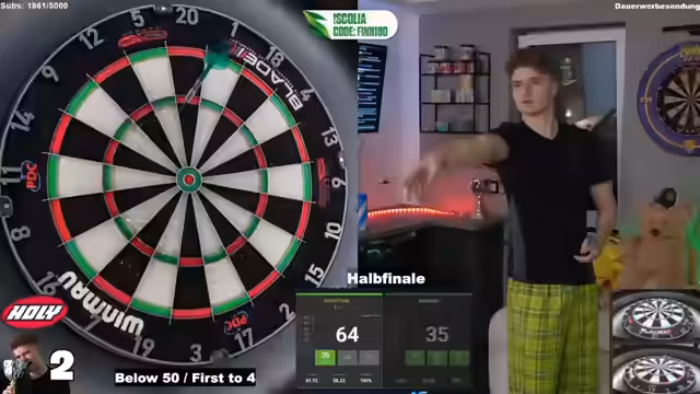 02:23:31Der Streamer freut sich über einen 60er Average über fünf Legs und eine 36%ige Checkout-Quote. Er scherzt, dass dies das Ende von Below-50-Turnieren bedeuten könnte, da es den Average zerstören würde. Nach dem Finale bleiben nur vier Minuten, um schnell etwas zu essen zu holen. Währenddessen wird eine Orange geschält, was sich als unerwartet schwierig erweist. Vor dem Finale gibt es noch Werbung für Holy, wobei auf die Probierpakete und Rabattcodes hingewiesen wird. Der Streamer erwähnt, dass er und Carlos bald einen Average von über 50 haben werden und somit aus den Below-50-Turnieren herauskommen. Es wird die Idee einer neuen Serie, 'Row 2 First Turniersicht below 60', in den Raum geworfen.