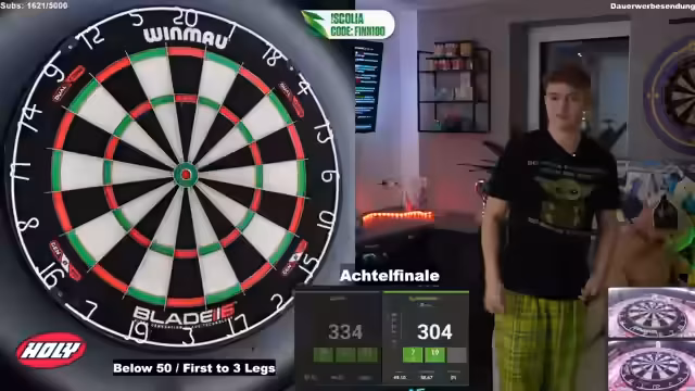 00:06:35Es startet eine Dart-Bot-Challenge, bei der es darum geht, in zwei Stunden gegen verschiedene Level von Dart-Bots auf Skolia anzutreten. Es wird von Level 1 bis Level 10 gespielt, wobei Level 10 einem Phil Taylor mit einem 105er Average entspricht. Der Streamer und Carlos treten separat in ihren jeweiligen Zimmern an. Es wird um fünf Subs gespielt, wobei derjenige gewinnt, der in zwei Stunden weiterkommt. Es wird 'Race to two legs' gespielt, um Zufallsergebnisse zu minimieren. Der Streamer demonstriert die provisorische Einrichtung von Carlos und lobt dessen Softbox. Es wird angekündigt, dass die Zuschauer Carlos' Perspektive auf seinem Kanal sehen können. Der Streamer erklärt die Regeln der Challenge, einschließlich der verschiedenen Dart-Bot-Stufen und des 'Race to Two Legs'-Formats. Er betont, dass es nicht nur um Glück geht, sondern darum, die Leistung zu bestätigen.