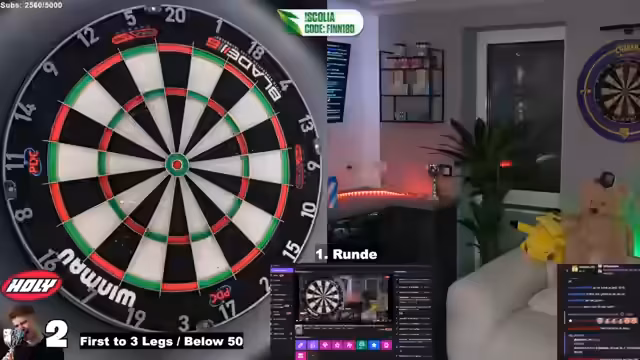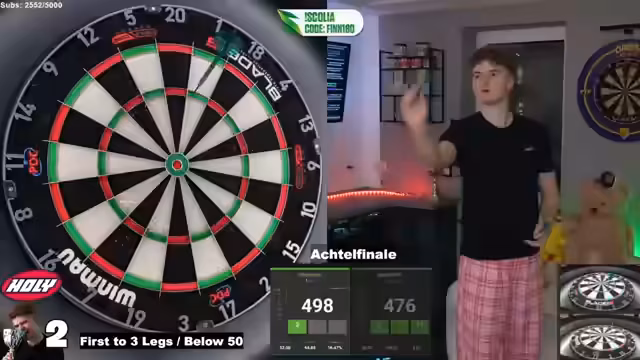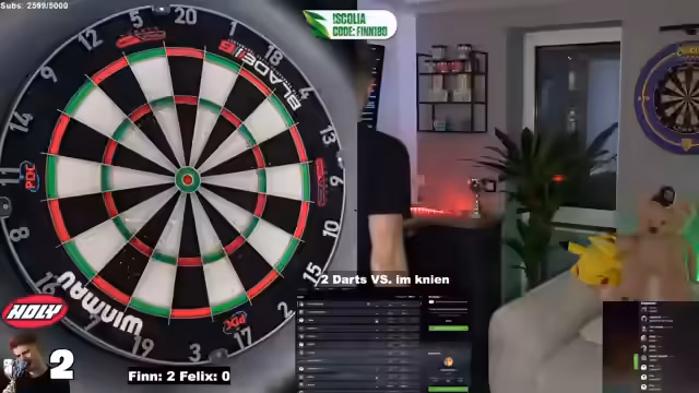03:29:08Bei einem Stand von 4-1 für die Streamerin erhält Felix ein besonders hartes Handicap: Er muss auf einem Bein werfen. Die Streamerin nutzt dies, um zum Sieg zu führen. Anschließend einigten sich beide auf ein Abschlussmatch, bei dem sie jedoch beide unter einem schwachen Durchschnitt leiden. Während des Spiels kommt es zu technischen Problemen, da der Ton bei beiden Streamern doppelt zu hören ist. Nach einigen Lösungsversuchen kündigt die Streamerin an, den Doppel-Stream zu beenden und eine finale Runde spielen zu wollen, ehe sie den Stream mit einem Raid auf Felix beendet.