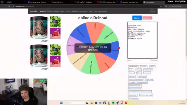 02:34:48Die Streamerin stellt das Konzept der Glücksrad-Challenge gegenüber Felix vor. Es handelt sich um ein Duell mit wechselnden Handicaps vor jedem Leg. Das Glücksrad bestimmt zufällige, spielerische Nachteile wie von einem Meter weiter entfernt werfen, im Sitzen auf einem Stuhl spielen, nur mit zwei Darts werfen oder auf einem Bein stehen. Ziel ist es, ein bestimmtes Anzahl an Legs zu gewinnen. Die beiden stimmen auf ein Best-of-Five-Format und starten sogleich mit dem ersten Durchgang, bei dem die Streamerin im Sitzen gegen Felix mit Mini-Darts antritt.