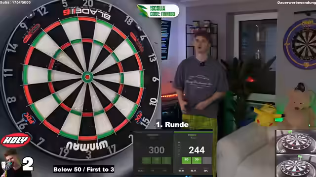 00:02:56Das Dartturnier beginnt mit der ersten Runde gegen Timbro087, der nur 13 Spiele gespielt hat und einen Durchschnitt von 41 aufweist. Der Streamer kritisiert, dass sein Gegner einen offensichtlich gefälschten Account hat. Während des Spiels wird über verschiedene Themen gesprochen, darunter die Hosenkollektion, die bald restocked wird, und die schwierigen Bedingungen des Spiels am Sonntag, wo oft Gegner ihr bestes Spiel zeigen. Trotz technischer Probleme und leichter Kopfschmerzen setzt der Streamer das Turnier fort.