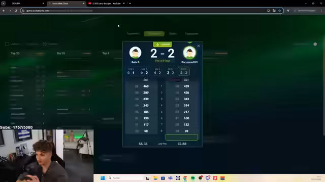 02:57:23Das Stream-Finale gegen Carsten beginnt mit einem klaren Hinweis auf den Durchschnittsscore des Gegners, der als sehr anspruchsvoll beschrieben wird. Der Streamer betont die Wichtigkeit der Konzentration, insbesondere zu dieser Tageszeit. Es wird erwähnt, dass der Gegner in den letzten Spielen konstant starke Leistungen gezeigt hat, was das Finale besonders spannend macht. Der Streamer bleibt motiviert und fokussiert, trotz der Herausforderung.