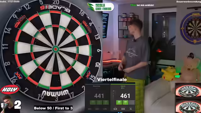 01:57:12Das Stream-Viertelfinale gegen Bela B. wird gespielt, wobei der Gegner als TikTok- und Instagram-Aktiver beschrieben wird. Der Streamer zeigt sich überrascht von der Leistung des Gegners mit einem 41er Average und äußert gespannte Erwartungen an das Spiel. Während des Spiels gibt es technische Probleme mit der Anzeige, aber der Streamer bleibt fokussiert und analysiert den Gegner, um eine Strategie zu entwickeln.