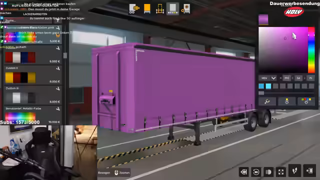 04:50:30Mit den erspielten Geldern wird die Investition in einen eigenen Auflieger als nächster Schritt genannt. Nach der Auswahl eines zweiachsigen Aufliegers im Stil des Schlafi-Brands, der als hässlich aber geil beschrieben wird, muss dieser von einer Garage in Deutschland abgeholt werden. Das neue Fahrzeug verspricht höhere Einnahmen, bis zu 70.000 Euro pro Auftrag.