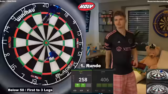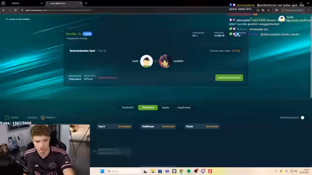 06:33:55Das angekündigte letzte Dart-Turnier beginnt, wird aber schnell zur Quelle von Frustration für den Streamer. Er spielt schlecht, seine Leistung ist mit einem Durchschnitt von unter 50 beschrieben. Der Versuch, sich mit einem Cäsar-Salat zu stärken, schlägt fehl. Ein Zuschauer wird als 'Bastard' und 'Hundesohn' beschimpft, nachdem er den Streamer als eingeschlafen tituliert. Nach der Niederlage gegen diesen Gegner steigt der Streamer frustriert aus dem Turnier und dem Stream aus.