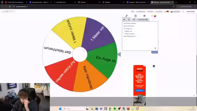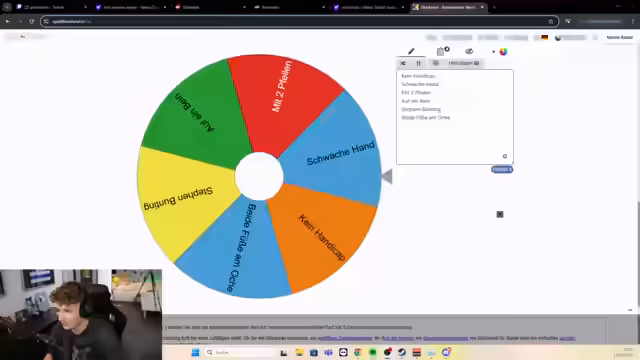 01:39:30Die Streamerin begrüßt die Zuschauer zu einem neuen Video und stellt den Gegner Carlos vor. Sie erwähnt das zuvor absolvierte, intensive Cricket-Match und kündigt direkt die nächste, gemeinsame Challenge an. Es geht um ein Handicap-Darts-Spiel, bei dem jeder Spieler ein eigenes, zufälliges Handicap für ein Leg erhält. Die Regeln werden erklärt: Das Spiel geht bis 5 Legs, und das jeweils gezogene Handicap wird nur für ein einziges Leg angewendet. Die Streamerin dreht ihr Glücksrad und erhält das Handicap 'Master Out', was bedeutet, dass sie das Spiel mit einem Triple statt eines Doppel beenden muss. Carlos erhält exakt dasselbe Handicap, was beide überrascht und zu humoristischen Kommentaren veranlasst.