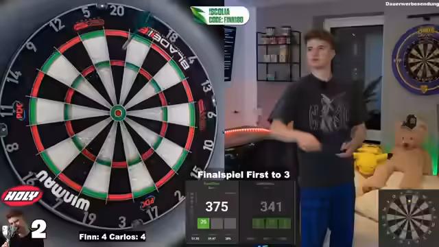 00:03:12Zu Beginn des Streams äußert die Streamerin Frustration über wiederholte Internetabbrüche auf Twitch, die Zuschauer verlieren. Kurz nach dem Start treten bei ihr und ihrem Gegner Carlos technische Schwierigkeiten auf, zu denen sie insoweit kommuniziert, dass zunächst unklar ist, bei wem das Problem liegt. Nach der Klärung, dass es sich um ein Anzeigefehler handelt, wird beschlossen, das Match neu zu starten, da Carlos zuvor im Spiel geführt hatte. Der Modus Cricket, bei dem nur die Zahlen 15 bis 20 und der Bull gezählt werden, um Felder zu blockieren und Punkte zu machen, wird dem Chat erklärt.