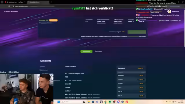 00:12:12Der Streamer äußert sich begeistert über die neuen Target-Bolide 03 Darts, die er von Paul Meier erhalten hat und plant, diese im Stream zu verwenden. Es wird kurz über den bevorstehenden Skolia Restock am Dienstag gesprochen, wobei ein Code erwähnt wird, mit dem man Versandkosten sparen kann. Der Streamer liest Sub-Nachrichten vor und bereitet sich auf das erste Turnier vor. Es wird erklärt, dass die Teilnahme am Gewinnspiel unabhängig von einem Abonnement ist. Der Streamer kündigt an, später im Stream zu erklären, wie das Gewinnspiel abläuft. Das erste Spiel beginnt gegen einen Gegner mit einem 45er Average, der bereits 13 Turniere gewonnen hat. Der Streamer erinnert sich daran, dass er bereits einmal von diesem Gegner besiegt wurde und betont die niedrige Doppelquote des Gegners. Der Streamer und Paul sind bereit für das Turnier und äußern den Wunsch nach einem Sieg. Es wird erwähnt, dass der Streamer bis vier Uhr morgens unterwegs war und Zwiewasser getrunken hat, was seine Leistung möglicherweise beeinflussen könnte.