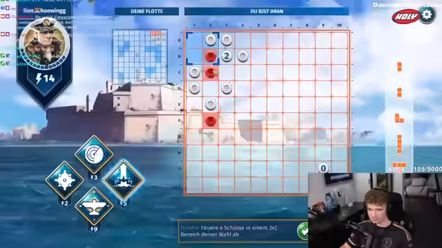 03:49:28Eine neue Runde Schiffe versenken mit Spezialfähigkeiten wird gestartet, wobei die Streamer gespannt sind, wie sich die neuen Elemente auf das Spiel auswirken werden. Es werden die Fähigkeiten Echolot, Bombe und Bombardement vorgestellt und diskutiert, wie man sie am besten einsetzen kann. Die Streamer überlegen, wie sie ihre Schiffe am besten platzieren und wie sie die Fähigkeiten des Gegners einschätzen können. Der Chat wird nach seiner Meinung gefragt, ob die Platzierung der Schiffe gut ist und ob die Spezialfähigkeiten richtig eingesetzt werden. Es wird erklärt, wie die Minen funktionieren und wie sie auf dem eigenen Brett platziert werden können, um den Gegner zu überraschen. Die Streamer tauschen sich über ihre Strategien aus und versuchen, die Taktik des Gegners zu durchschauen, um ihre eigenen Züge optimal zu planen.