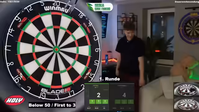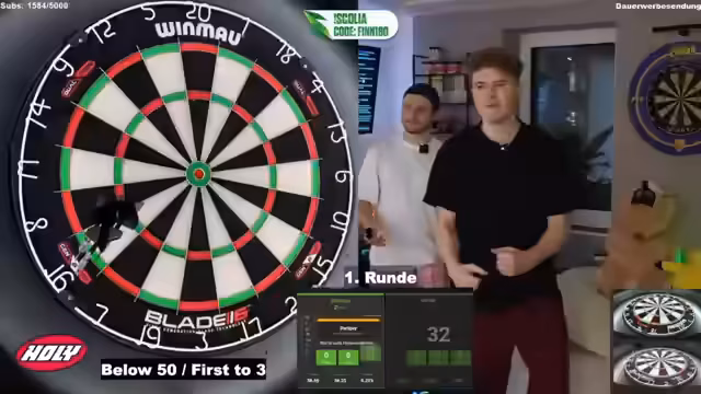 02:30:52Während des gemeinsamen Darts-Spiels beklagen die Streamer ihre Leistung. Sie haben Schwierigkeiten mit dem Touch-of-Triple und den Doppelfeldern, was sich auf ihren Average auswirkt. Carlos beschreibt sich selbst als einen Rhythmusspieler, der erst nach einigen Würfen in den Spielkomme findet. Sie spielen ein klassisches Turnierspiel, bei dem es darum geht, die Angriffsmodi zu überstehen und den Durchbruch zu schaffen, merken aber an, dass sich das gemeinsame Spiel auf die Doppel schwieriger gestaltet als allein.