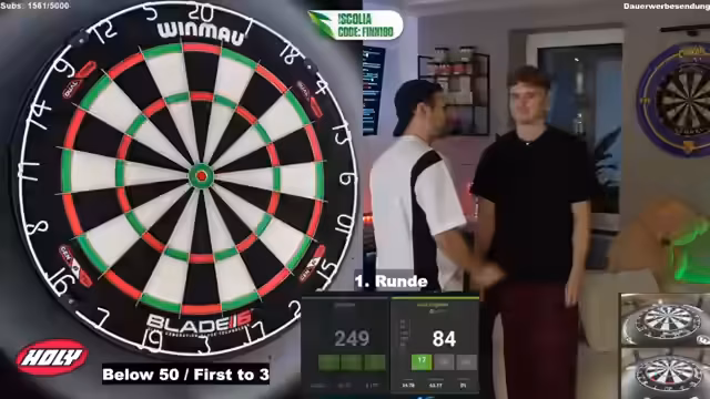 02:43:07Das Streamer-Duo qualifiziert sich für das Achtelfinale eines Turniers und analysiert ihren neuen Gegner, Kenny. Sie stellen fest, dass ein durchschnittlicher Score von 38 nicht ausreichen wird, um zählbare Erfolge zu erzielen. Auf dem Weg zum Viertelfinale planen sie, ihren Average zu steigern. Gleichzeitig kommt es zu technischen Problemen, als Carlos einen besonders lauten Furz produziert, der als "Bassboosted" bezeichnet wird. Dieser Vorfall führt zu einem kurzen, humorvollen Streit über die Mikrofon-Empfindlichkeit.