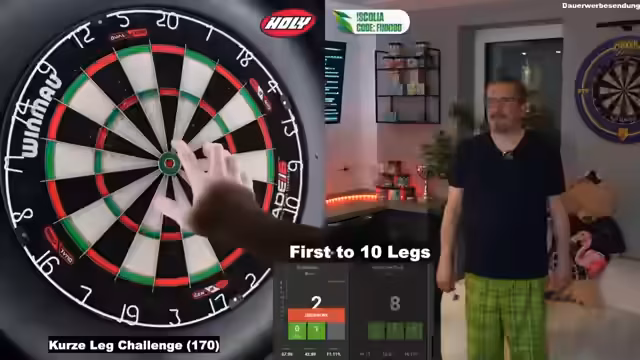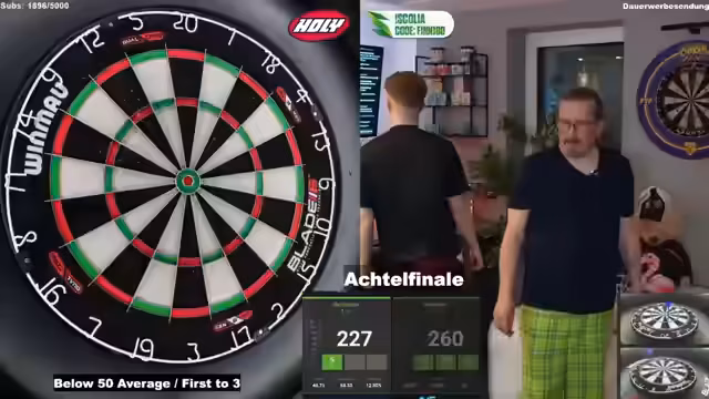 00:08:15Ein YouTube-Intro wird aufgenommen, in dem Frank the Tank, der Vater des Streamers, als Gast vorgestellt wird. Der Stream wird als Live-Event auf Twitch beworben. Es wird angekündigt, dass im Stream Dart-Turniere gespielt werden sollen, mit dem Ziel, eines zu gewinnen. Der Streamer erinnert an einen früheren Erfolg mit Paul Mayer, gesteht aber ein, wenig dazu beigetragen zu haben. Der Druck, diesmal auf dem gleichen Niveau zu spielen, wird thematisiert. Es wird humorvoll auf schlechte Würfe und deren Ursachen eingegangen und ein Bull-Start angekündigt. Der Streamer erwähnt, dass die Zeit runtergestockt wurde. Ein Zuschauer kommentiert den braunen Teint des Vaters, woraufhin dieser seinen Job als Wanderführer erklärt. Der Streamer bittet um Likes und Abos auf dem Dartkanal und erwähnt, dass sie sich bereits warmgespielt haben.