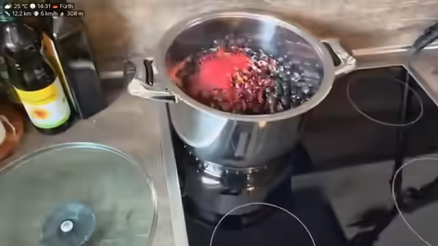 03:53:09Der Streamer gibt eine große Menge Zucker in den Topf mit der kochenden Marmelade und rührt um. Er erwähnt, dass Zimt gut zu Trauben passt und fügt etwas hinzu. Er rührt weiter um und fragt nach der Meinung zur Kameraperspektive. Der Streamer erwähnt, dass er vielleicht noch Sirup aus den restlichen Trauben machen wird. Er macht einen Test, um zu sehen, ob die Marmelade fest wird. Er ist stolz auf das Ergebnis und verkündet, dass die ersten Gläser abgefüllt werden. Der Streamer packt das Stativ und bereitet das Abfüllen vor. Er entfernt den Schaum von der Marmelade, da er im Glas nicht schön aussieht. Die ersten Gläser werden abgefüllt und verschlossen. Der Streamer stellt fest, dass sein System nicht optimal ist. Er erklärt, warum er die Gläser auf den Kopf stellt: um ein Vakuum zu erzeugen und den Deckel zu desinfizieren. Er schätzt, dass die Gläser etwa 125 Milliliter fassen und dass er etwa 24 Gläser hat. Der Streamer muss schneller arbeiten und erwähnt, dass es weihnachtlich riecht. Er muss noch Gläser aus dem Keller holen und bemerkt, dass ein Deckel kaputt ist.