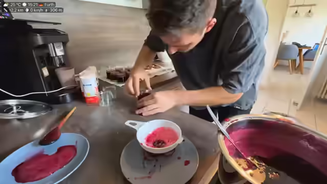 03:32:52Der Streamer siebt die gekochten Trauben ab, um Schalen und Kerne zu entfernen. Er beschreibt die Flüssigkeit als Elixier und vergleicht den Vorgang mit ASMR. Er verwendet eine Schale, um das Durchtropfen aufzufangen. Dabei bemerkt er die vielen Kerne und warnt davor, das Shirt nicht zu bekleckern. Unglücklicherweise passiert es doch und das weiße Lieblings-T-Shirt wird mit roter Marmelade bekleckert. Der Streamer ist verzweifelt und fragt den Chat um Rat, wie er den Fleck entfernen kann. Er überlegt, Waschmittel zu verwenden oder das T-Shirt in die Badewanne zu legen. Letztendlich gibt er auf und beschließt, das T-Shirt mit den Flecken einfach weiter zu tragen, da er viele T-Shirts hat. Er wechselt das T-Shirt und fährt mit dem Stream fort.