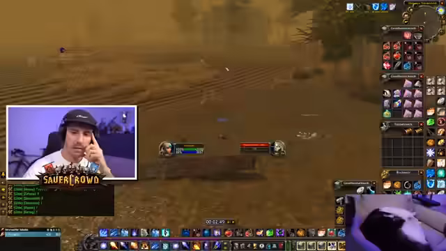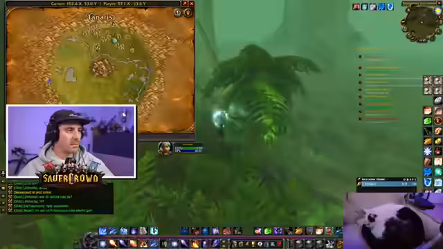 02:37:17Das Duo im Gebiet Un'Goro Krater arbeitet synchron. Ein Streamer agiert als Tank und zieht die Mobs mit aggro auf sich, während der andere mit massivem AoE-Schaden die Gegner eliminiert. Das Gameplay ist gefährlicher geworden, da nun auch Level-60-Elite-Mobs im Gebiet spawnen. Die Strategie, NPCs zu ziehen und zu kiten, wird erörtert, um gegen gefährlichere Gegner zu bestehen. Zusätzlich wird die Jagd auf bestimmte Quest-Items wie Gorillapelle intensiviert.