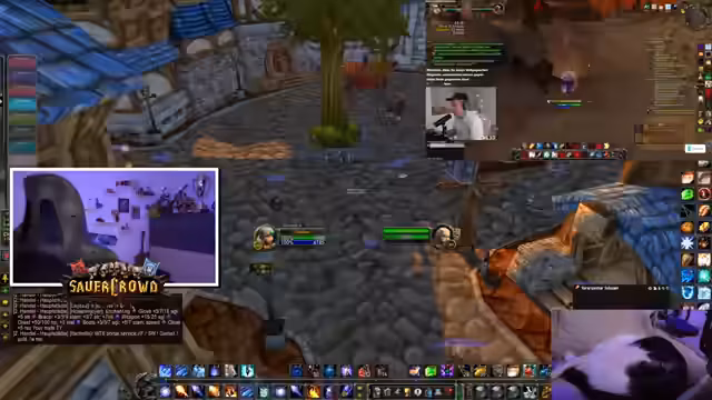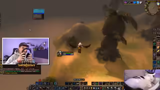 01:40:26Nach seiner Rückkehr vom Essen plant der Streamer, in die Elfenstadt Darnassus zu fliegen, um dort einen Port für die Gilde zu holen. Er ist jedoch unsicher über den genauen Weg und stößt auf einige technische Hürden. Während der Reise gibt es weitere Zwischenfälle, wie das Laggen und ein versehentliches Layer-Switching. Der Streamer ist sichtlich nervös, da das Gebiet gefährlich ist. In Darnassus angekommen, wird er sofort von Gildenmitgliedern kontaktiert, die einen Port benötigen. Er nutzt die Zeit, um Wasser herzustellen und bittet die Zuschauer, während seiner kurzen AFK-Zeit weiter zu quatschen.