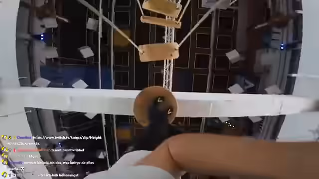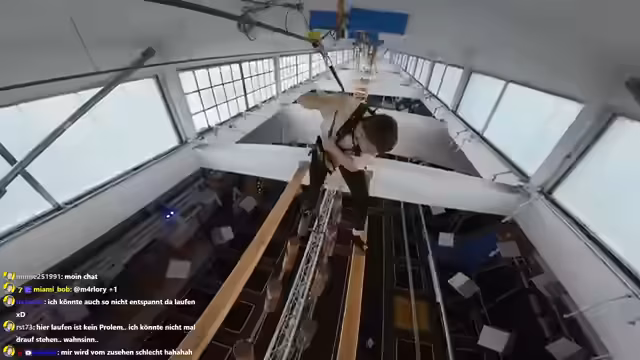 03:10:16Während des Parcours-Runs durchlaufen die Streamer verschiedene Routen, die als einfach, mittelschwer und superschwer eingestuft werden. Es kommt zu beeindruckenden Momenten wie dem Sprung vom Trampolin in die Airbag-Landematte und dem Versuch, ohne Hände über instabile Elemente wie Wackelbretter zu gehen. Dabei wird mehrfach die Höhe von rund 15 Metern betont, was bei einigen Teilnehmern Höhenangst auslöst. Die Streamer überwinden diverse Hindernisse wie Hangelbretter und Ringe und diskutieren dabei den Aufwand und die Angstschweiß der Seile.