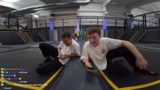 01:22:56Zu Beginn erkundet der Streamer die Trampolinhalle und versucht, sich zurechtzufinden. Er ist sich unsicher über seine eigene Rotation und Angst, zu viel zu drehen. Nachdem sie die Halle für sich alleine haben, konzentrieren sie sich auf ein Gerät namens Cageball, bei dem man den Ball in ein Loch treten muss. Es gibt technische Schwierigkeiten beim Start, da der Startknopf defekt ist. Nachdem das Problem behoben ist, beginnen sie, das Gerät auszuprobieren und entwickeln Strategien, wer länger durchhält.