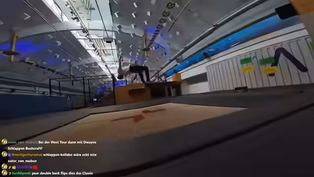 00:27:36Bereits vor dem Betreten der Halle wird intensiv über die geplanten Tricks diskutiert. Die Streamer setzen sich Ziele wie einen Barani (halbe Vorwärtsschraube) oder sogar eine Kombination aus Barani in einen Backflip. Die technische Theorie wird besprochen, etwa die Wichtigkeit der Arme für den Schwung und die Landung. Diese Vorbereitung unterstreicht den sportlichen Charakter des Streams und die Ambition, nicht nur zu springen, sondern auch Tricks zu lernen.