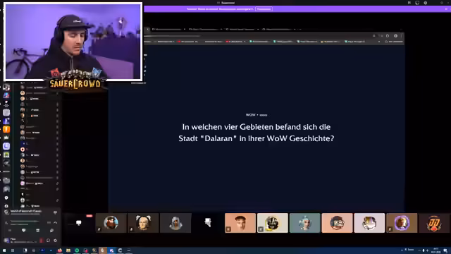 01:30:50Um 18 Uhr wird ein großes Event, die "Gaming Show", angekündigt. Der Streamer organisiert die Teilnahme über einen Discord-Link, der nicht geleakt werden darf. Das Event ist ein Quiz, bei dem verschiedene Völker gegeneinander antreten. Punkte werden durch das Beantworten von Fragen in den Kategorien Film, TV, Biologie, Allgemeines Wissen und WoW gesammelt. Am Ende können die Punkte für das Öffnen von Truhen verwendet werden.