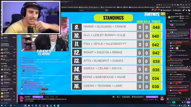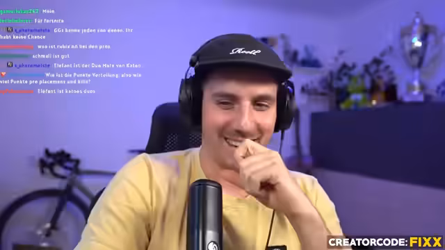 00:11:56Das Hauptthema des Tages ist die Teilnahme am 20.000€ Creator Cup von DaveKnight. Gespielt wird im Trio-Modus auf der Fortnite OG-Map ohne Bauen. Die Teams bestehen jeweils aus einem männlichen und einem weiblichen Creator sowie einem zugelosten Profi-Spieler, der jedoch nur eine Pistole benutzen darf. Der Streamer zeigt sich siegessicher und analysiert bereits potenzielle Dropspots auf der Karte.