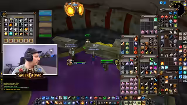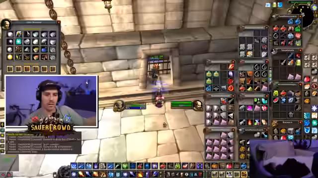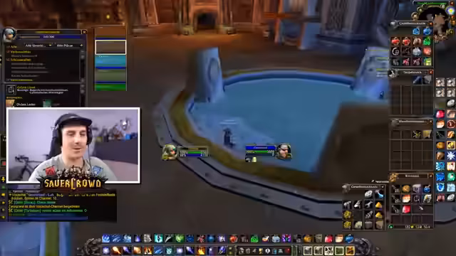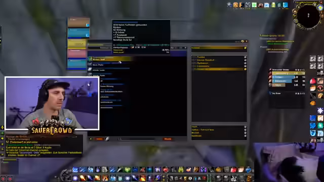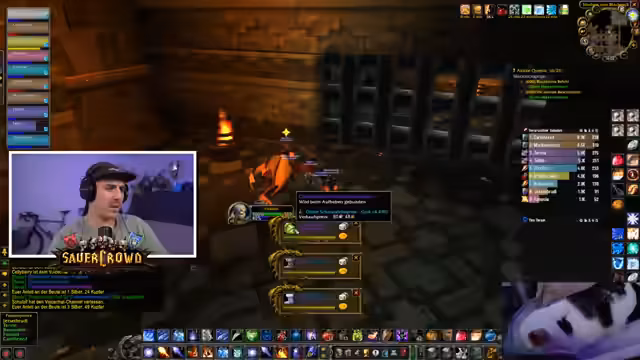 00:08:34Im Stream interagiert der Streamer intensiv mit seiner Gilde, insbesondere im Gildenchat. Es geht hauptsächlich um die Organisation von Gegenständen und das Nutzen des Gildenbanksystems. Er versucht, Items wie Mitrilbarren und Brot für andere Gildenmitglieder zu besorgen, die Hilfe benötigen. Dabei tauchen technische Probleme mit dem Add-on für die Gildenbank auf, das nicht korrekt funktioniert und von der Organisation ein Update benötigt, um wieder lauffähig zu sein.