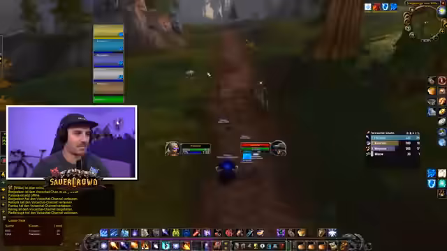 08:45:55Die Gruppe beginnt die Reise zum neuen Dungeon-Ziel. Auf dem Weg durch das Gebiet wird vor den starken Mobs gewarnt, insbesondere vor den sogenannten Moorlords, die als sehr tanky und gefährlich beschrieben werden. Es wird eine beinahe brenzige Situation aus der Vergangenheit geschildert, in der die Gruppe einen solchen Mob nur knapp bezwingen konnte. Der Streamer weist darauf hin, dass der Dungeon für die Horde gedacht ist, was auf dem Weg durch feindliches Gebiet hinweist.