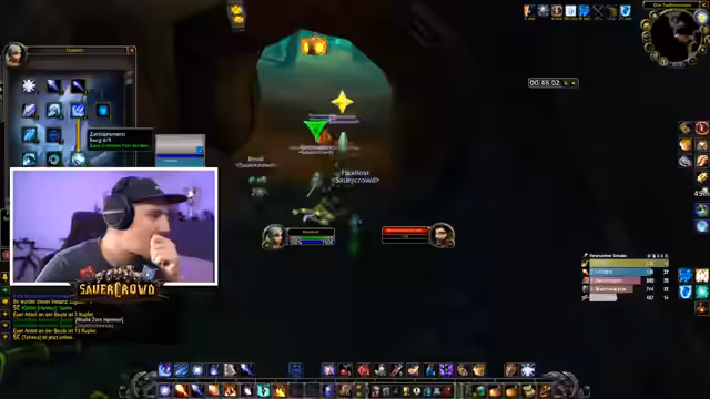 05:22:26Das Duo begibt sich in eine Höhle, um eine dort befindliche Quest zu erledigen. Die Umgebung wird als unbekannt und potenziell gefährlich eingestuft. Nachdem Erz abgebaut wurde, wird ein Großpull unternommen, um mehrere Gegner auf einmal zu bekämpfen. Dies führt zu einer angespannten Situation, in der der Heiler seine Mana-Ressourcen management und der Tank Aggro halten muss, um den Kampf zu überstehen.